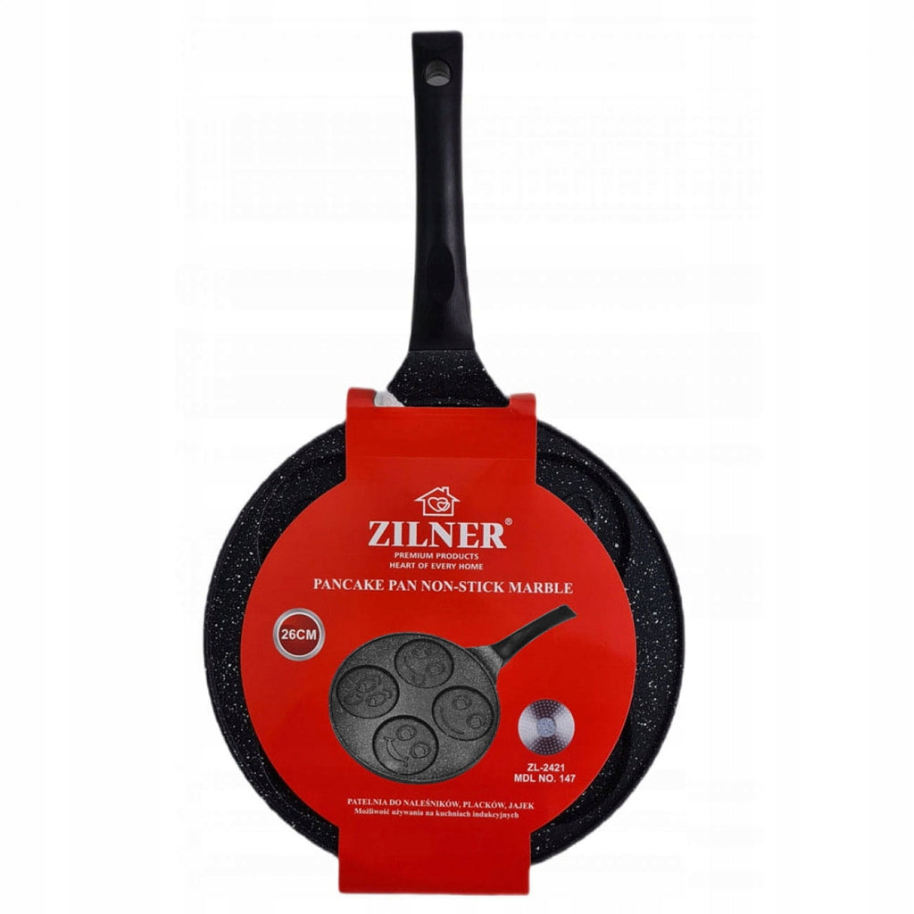 Тиган ZILNER със 4 форми на усмихнати лица е идеалният съд за една забавна и различна закуска. Мраморното му покритие се характеризира с много висока устойчивост на абразия и залепване,  не реагира с храната, което прави храната по-здравословна и вкусна. Дъното на тигана има отлична топлопроводимост, което спестява много енергия.